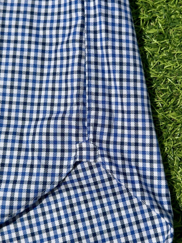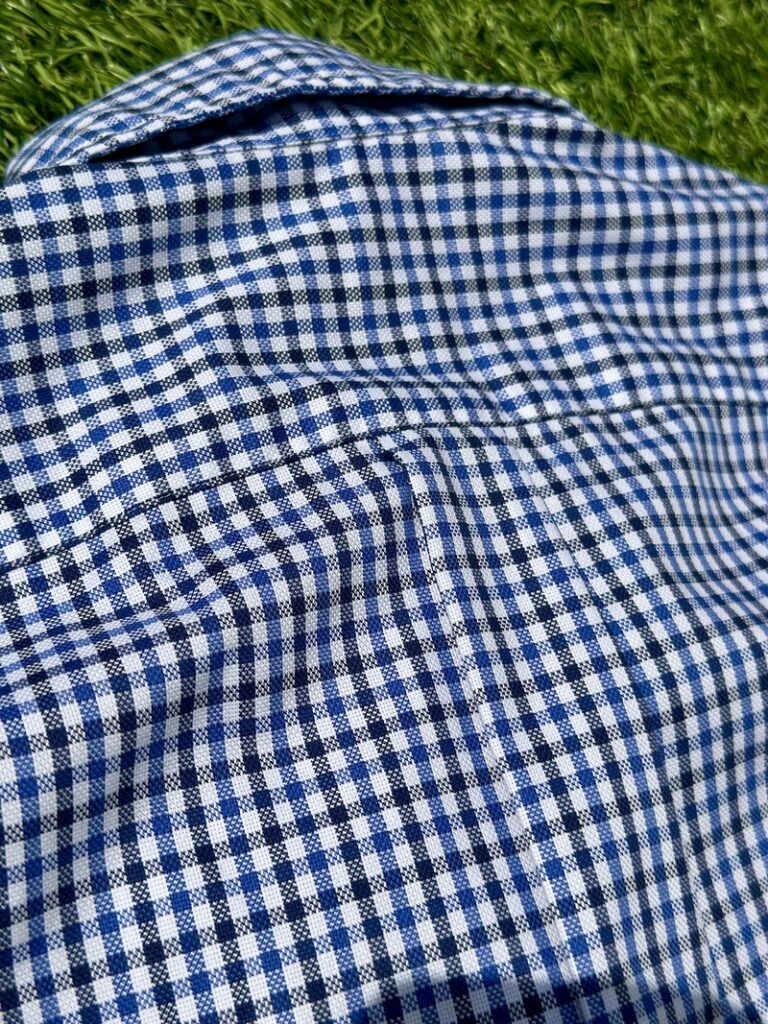 Of course, it’s a pre-dyed white base with a French blue and navy check pattern!