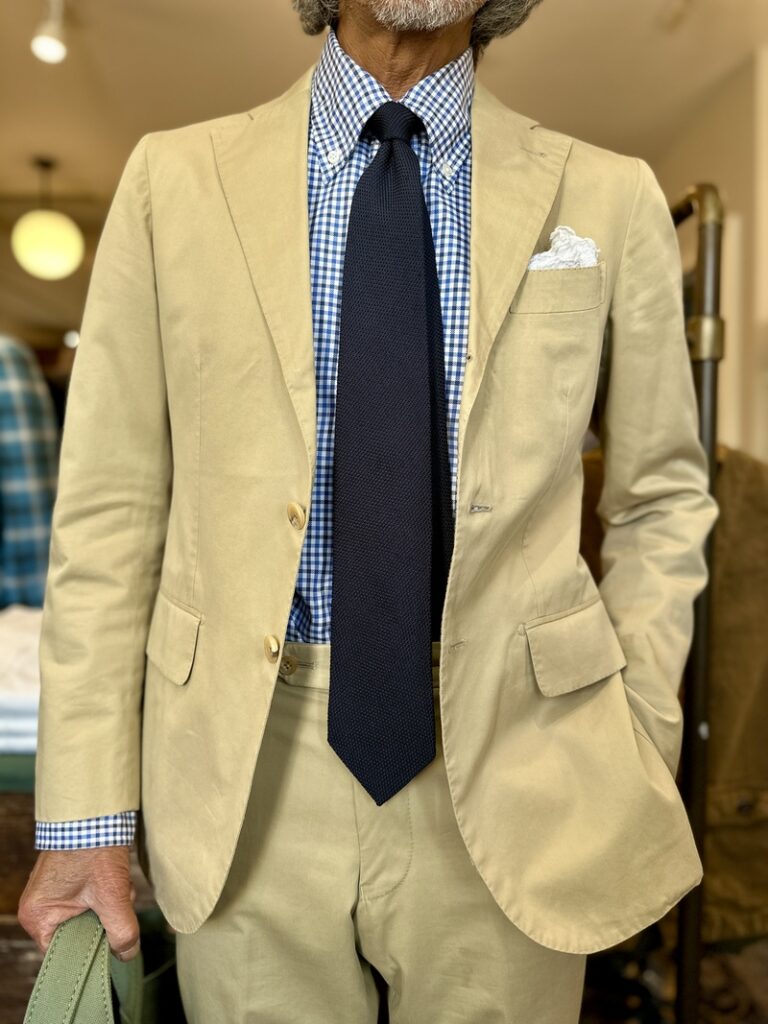 ネイビーソリッドのニットタイにお仕立てを楽しめるチノスーツなどにも良くお似合いになりますね。