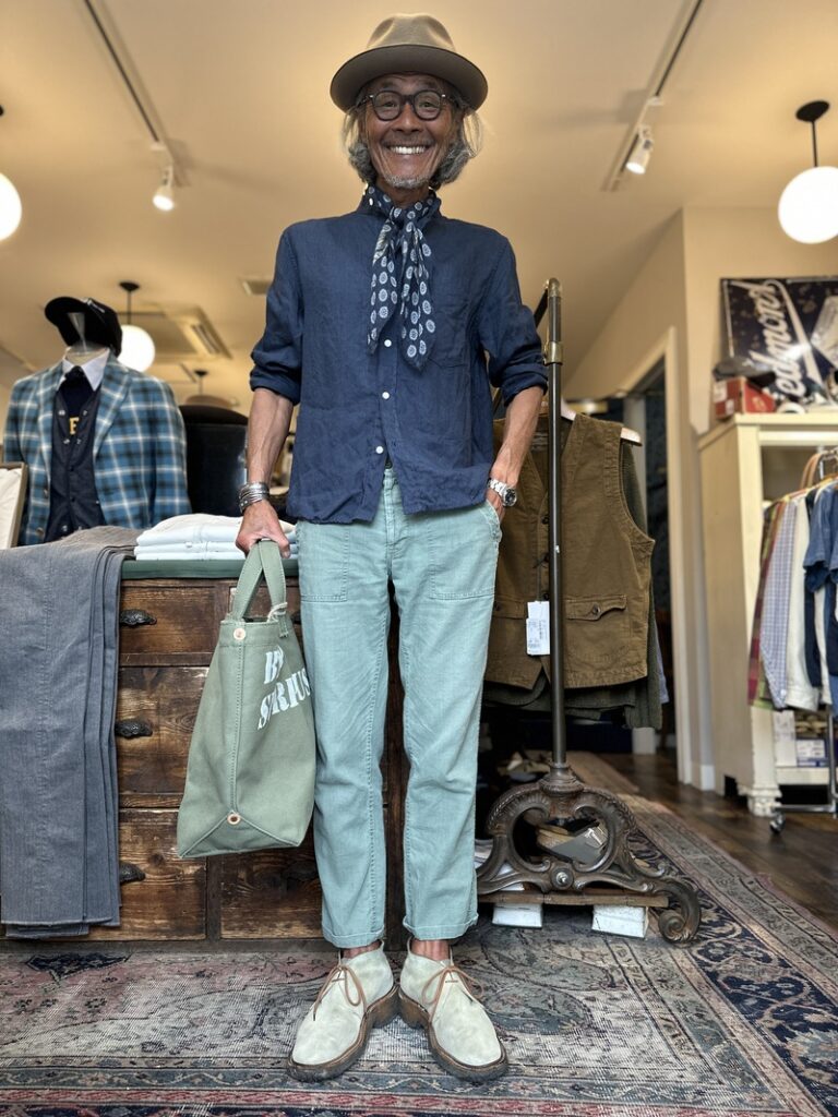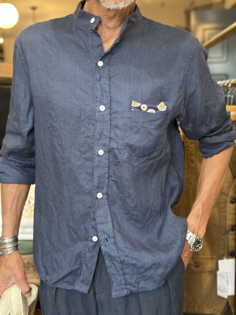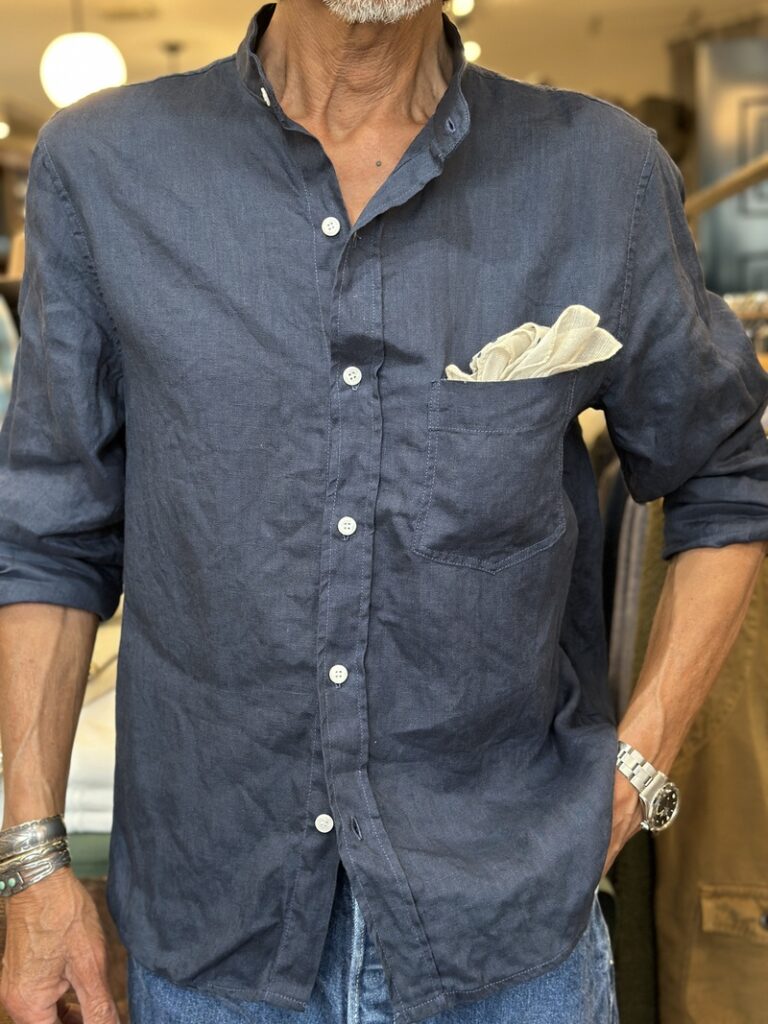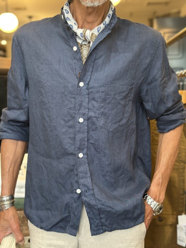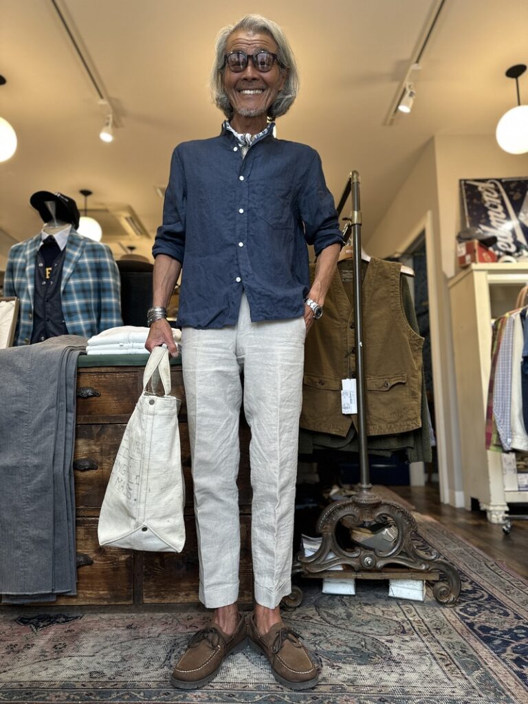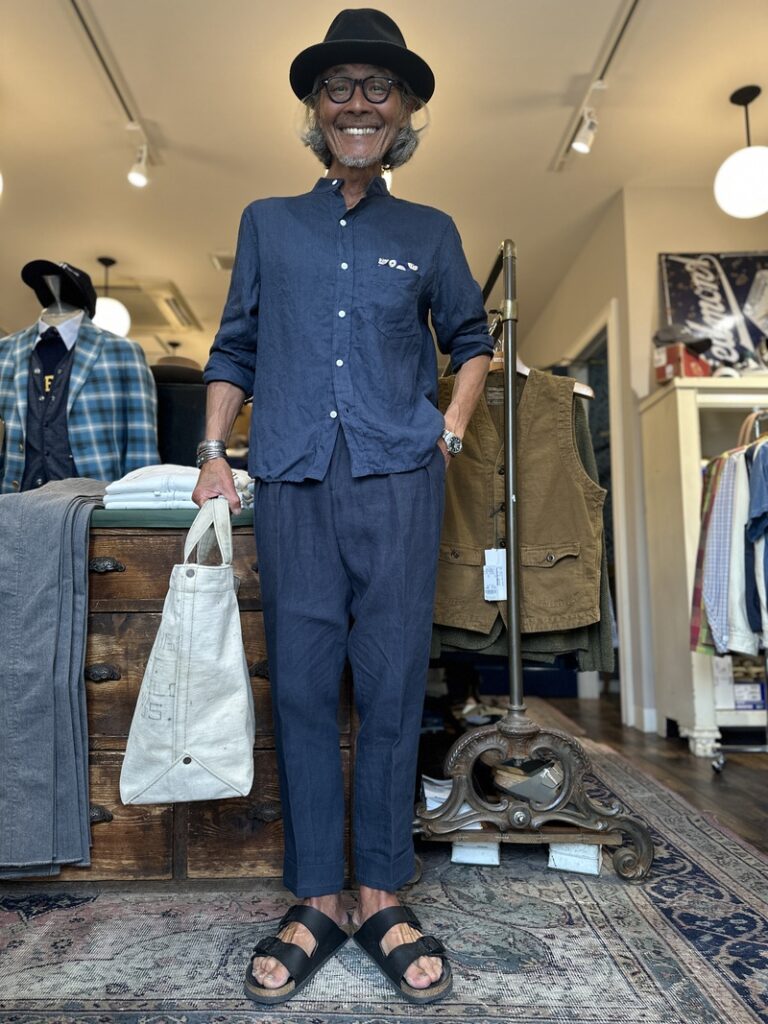 イタリアのBerwichの麻のトラウザーズなどコーディネィトされましてオールネイビーのコーディネィト