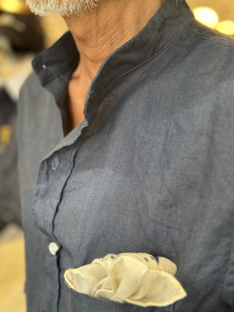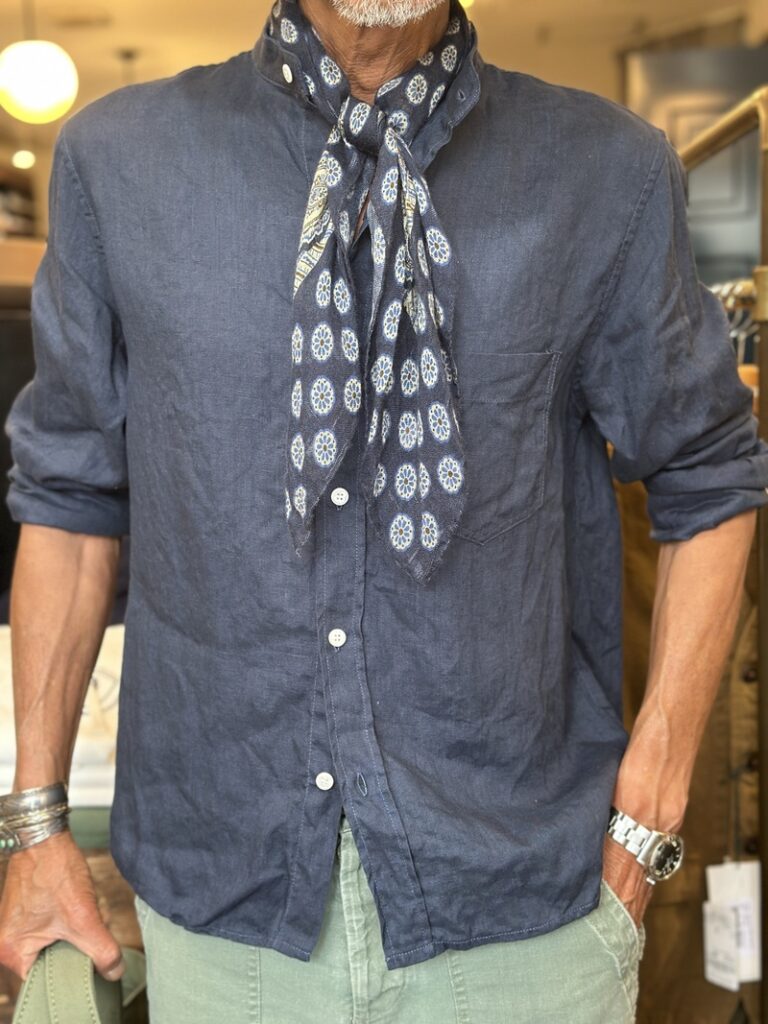 This is also a linen-cotton scarf by Vincenzo Miozza, but when worn outside a shirt,