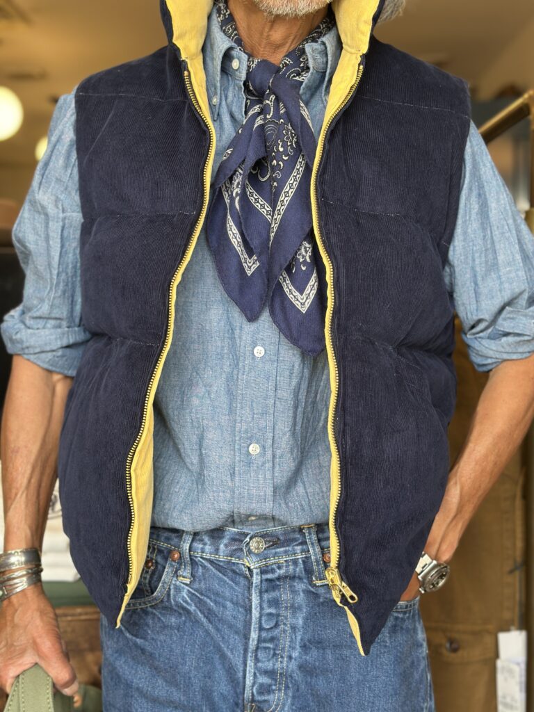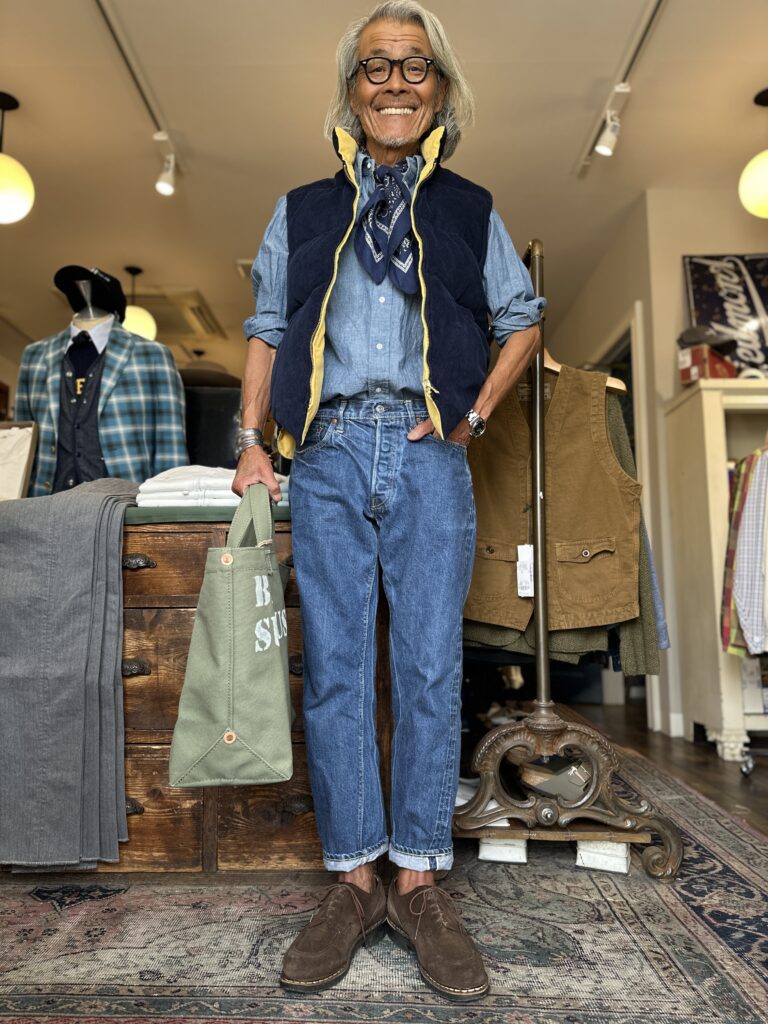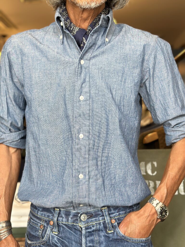 秋口などにはボーイズマーケット別注ヴィンテージシャンブレーBDシャツなどにコーディネィト