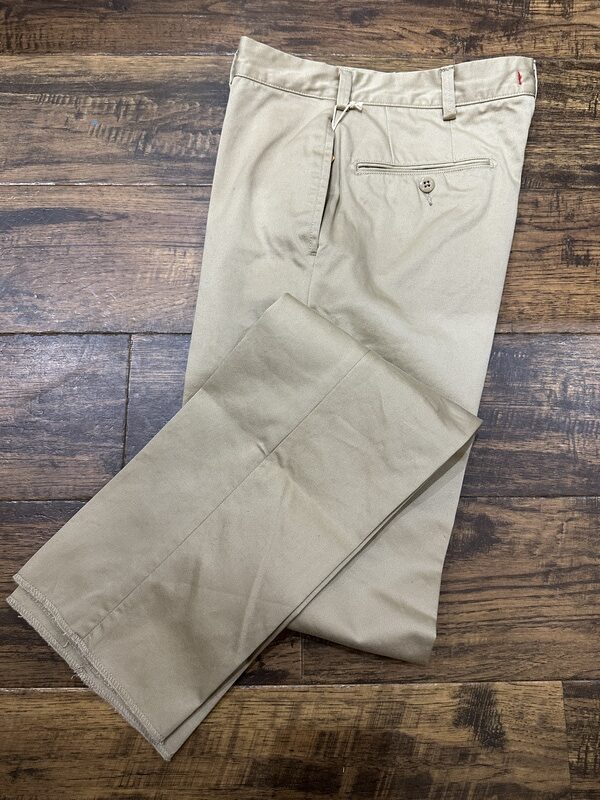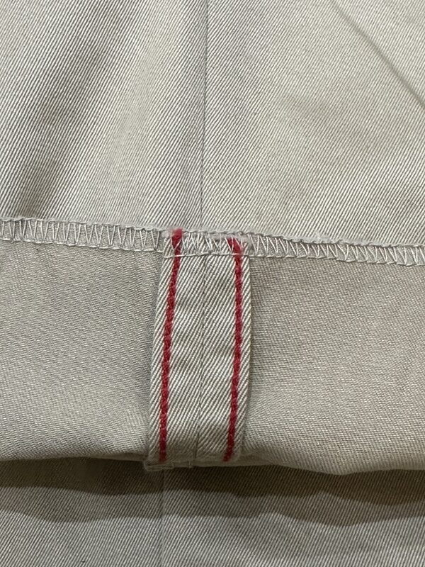 The side seams of these trousers are finished with machine stitching, giving them a red selvedge-like appearance.