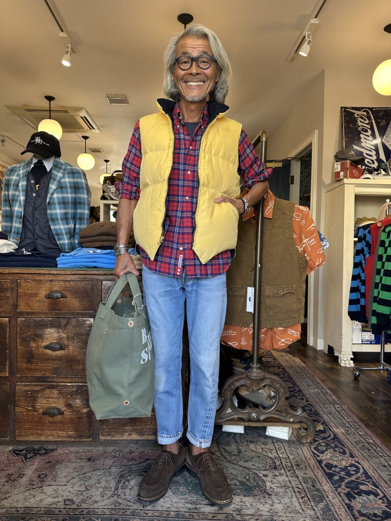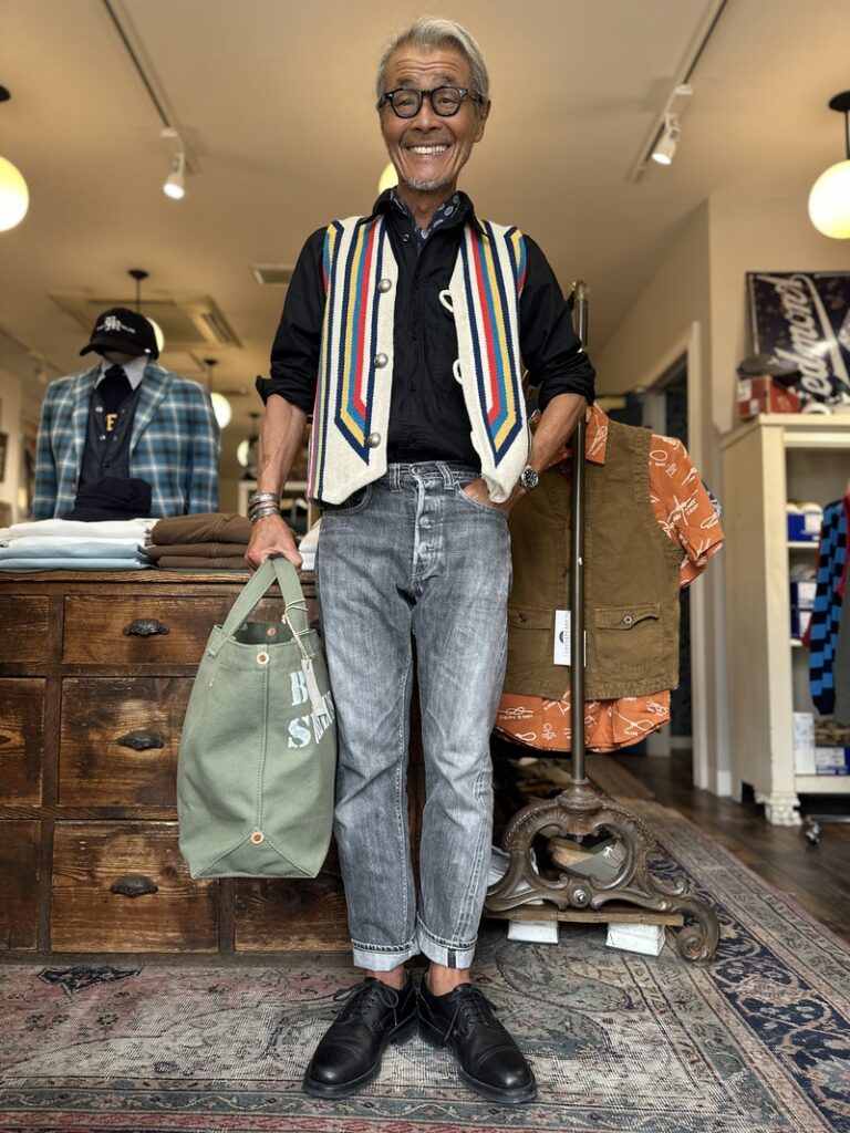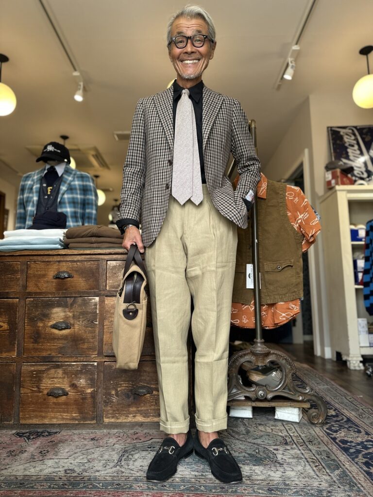 足元、YUKETENにOPERAスウェードで別注しました70年代スタイルのビットモカシンなどお勧めですね。