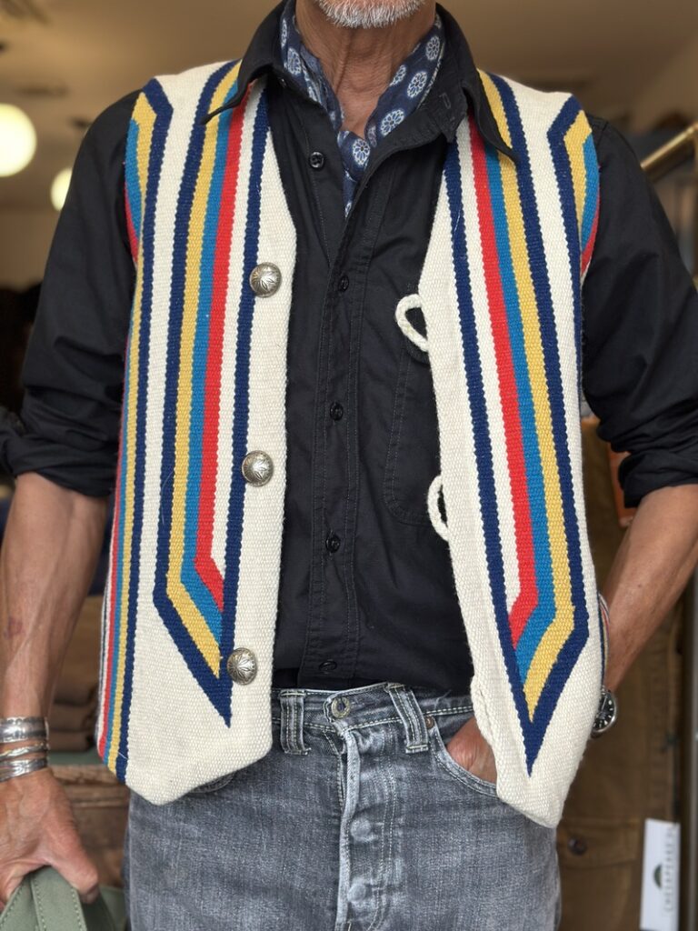 The Trujillos rug vest, which was custom-made with Navajo stripes, looks great on you.