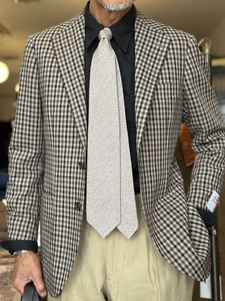 チャコールグレーとブラウンの格子柄のジャケットなどにコーディネィトされるのもお勧めですね!