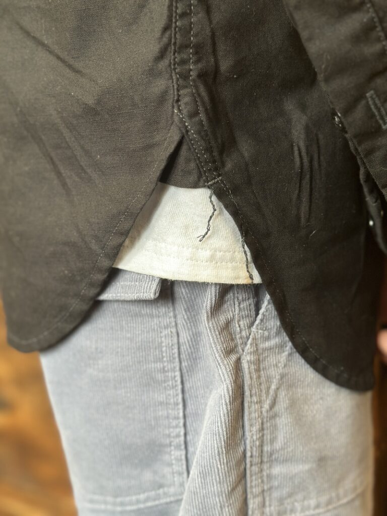 ワークシャツのディティールなのでサイドプリーツを採用しております。