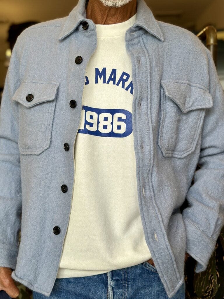 This beautiful sax blue wool mossa shirt will look great with our boys’ custom-made CPO shirts.