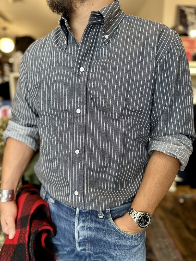 This piece combines hickory denim with a work-inspired feel and an Ivy League touch!
