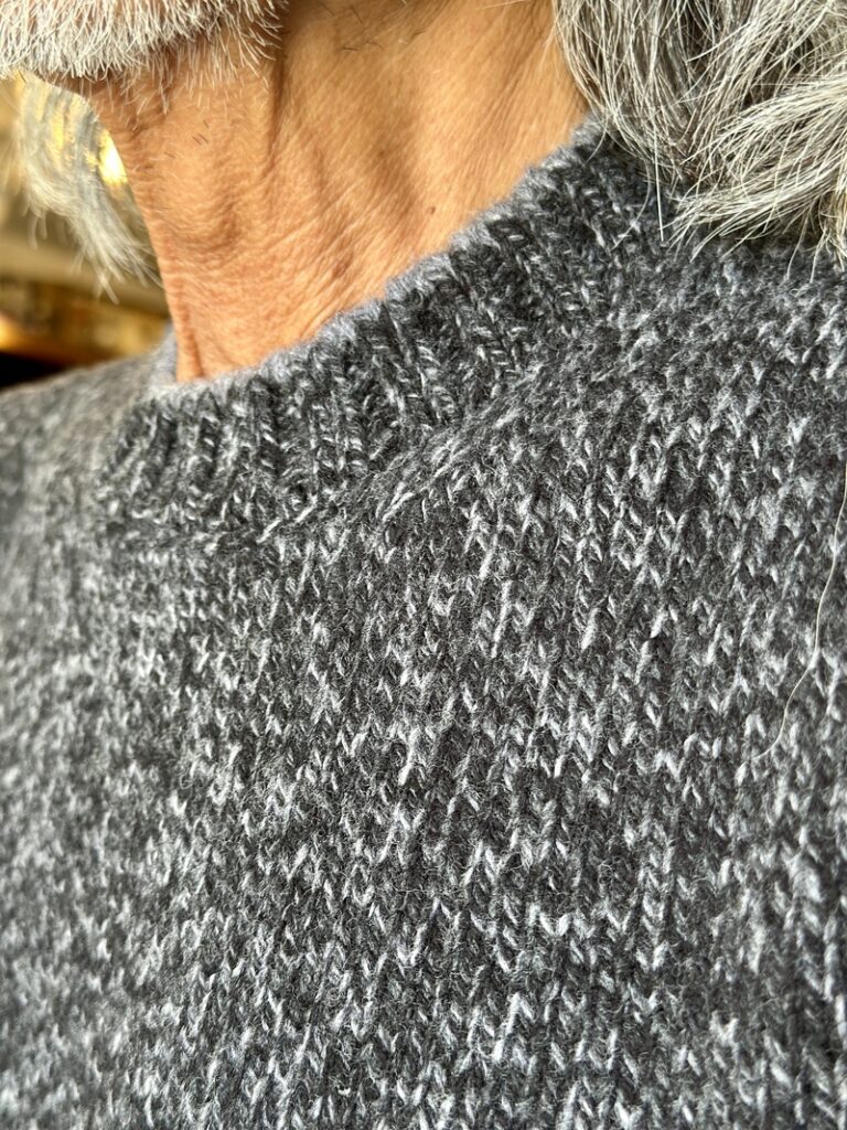 The final knitting of the collar is middle grey!