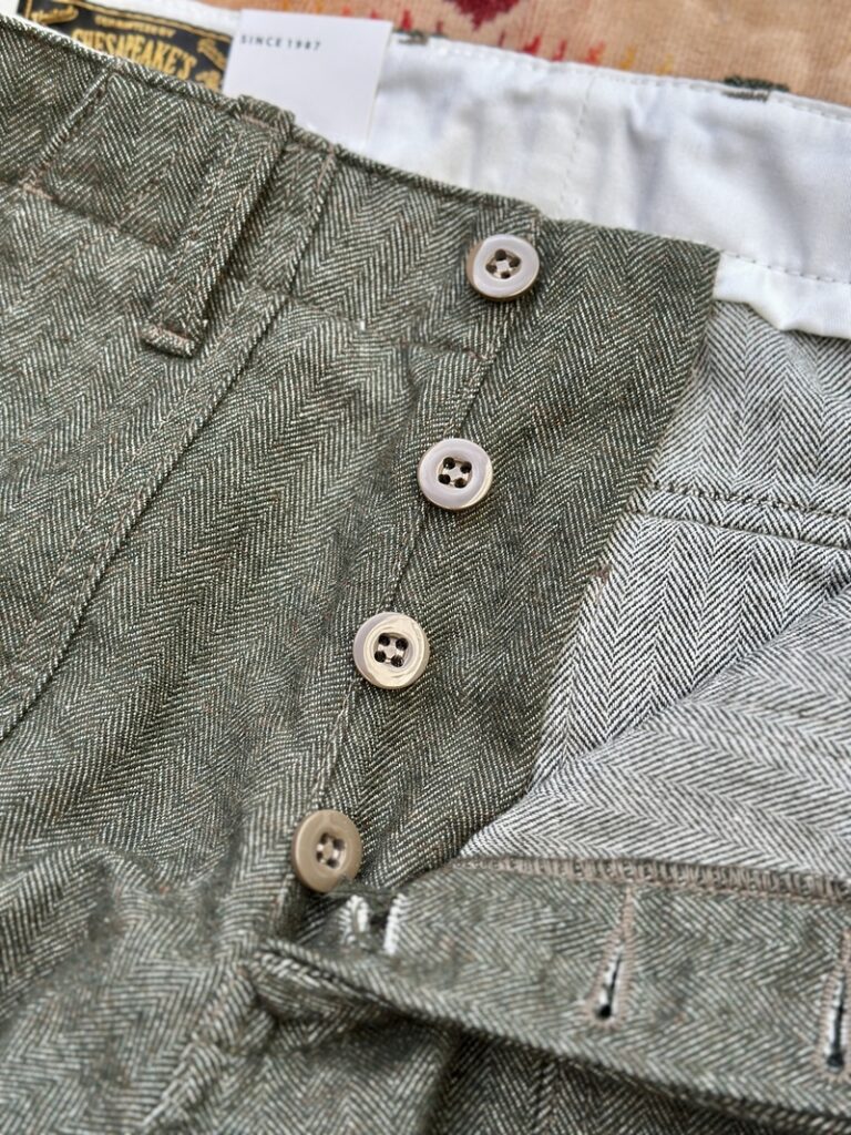 サイドの縫製も巻き縫いを採用しておりますのでパッカリングなどで立体的なパンツと仕上がってくると