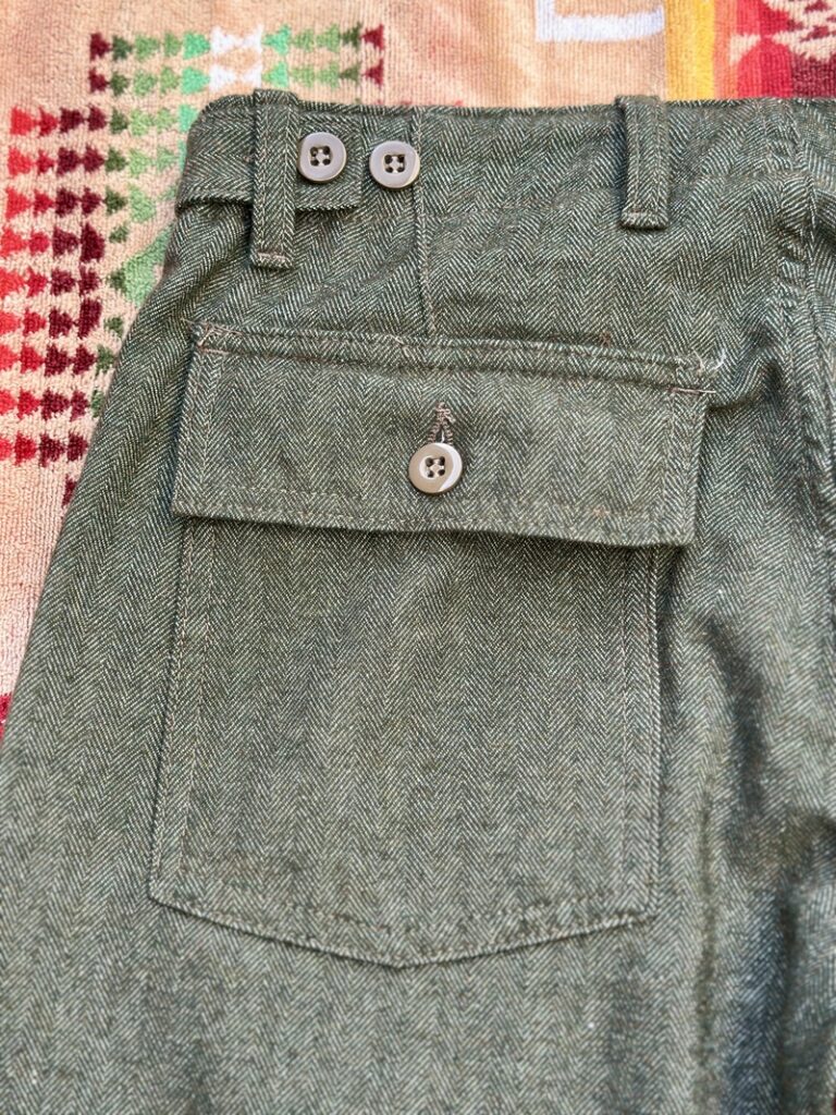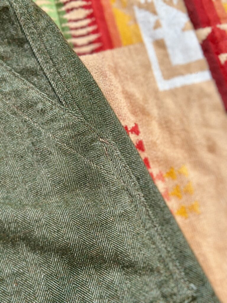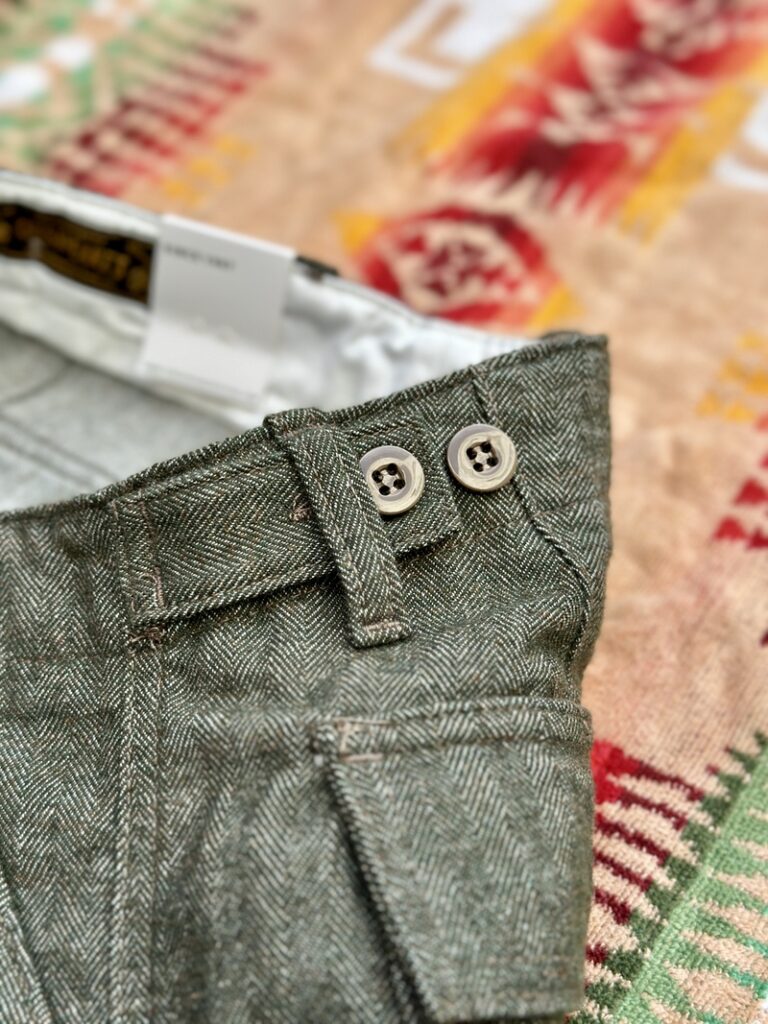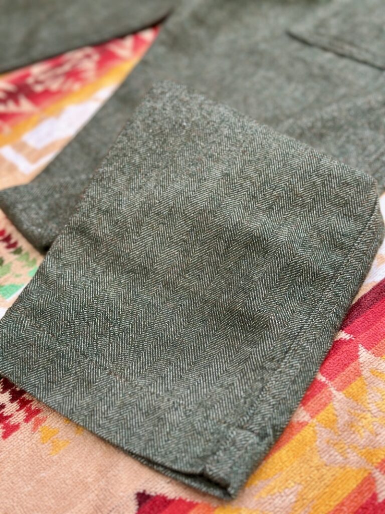 オリーブグリーンを基調としましたヘリンボーン素材はさも男好きするのではないでしょうか!