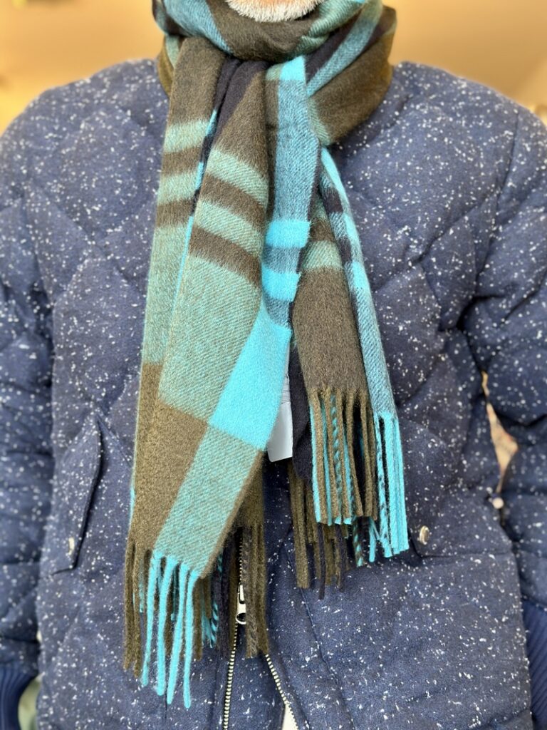 It’s long, but not too wide, so it fits perfectly around the collar when wrapped around a coat.