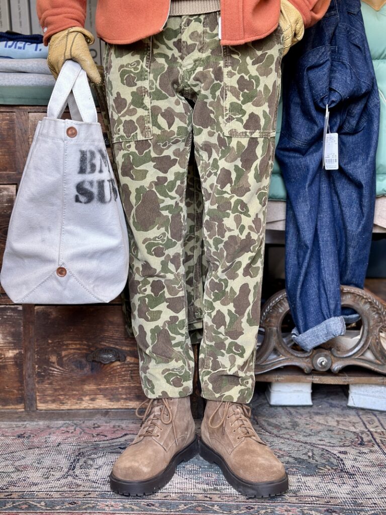 CHESAPEAKESにコーデュロィのフロッグスキンカモフラージュで別注しましたベーカーパンツなどにも