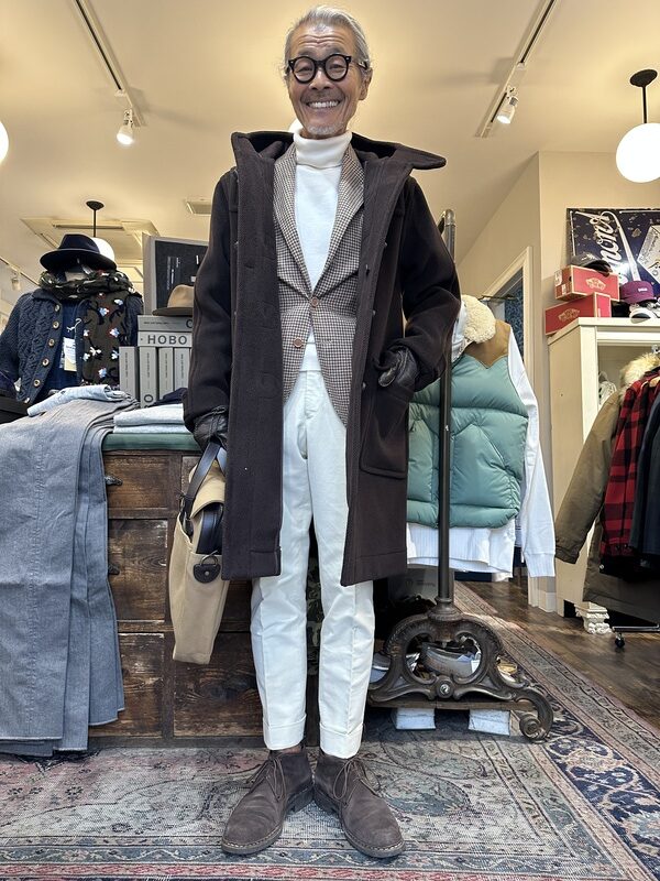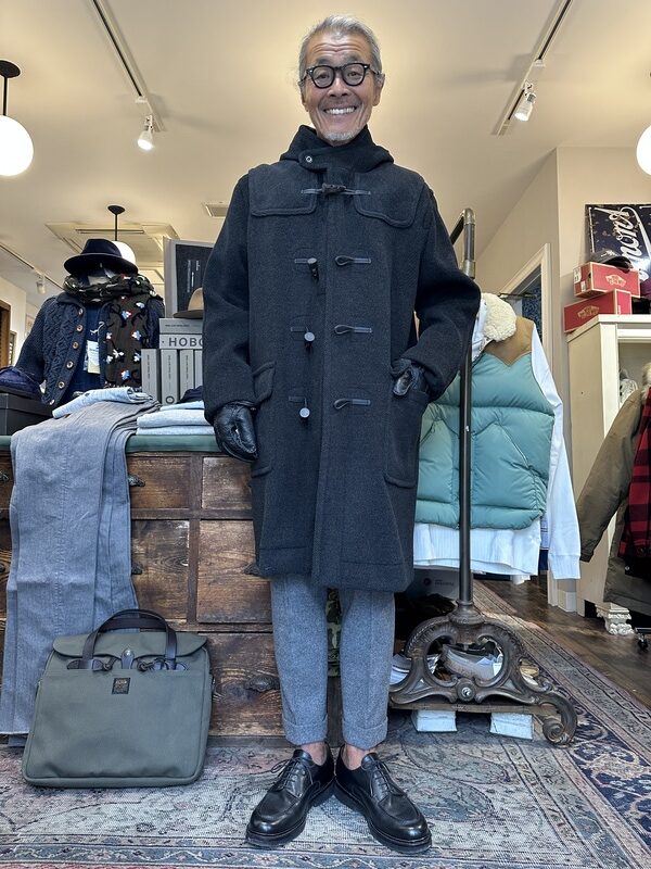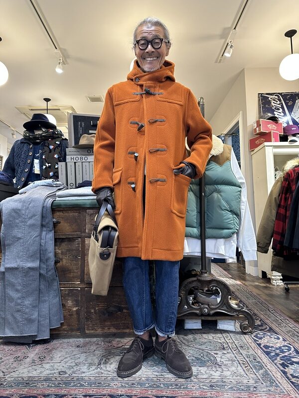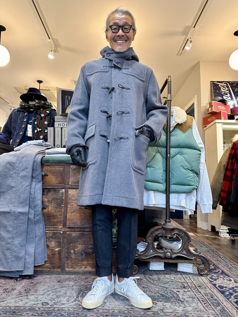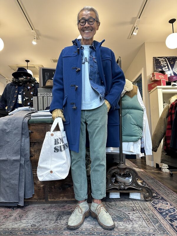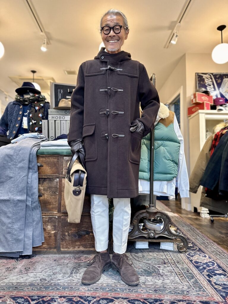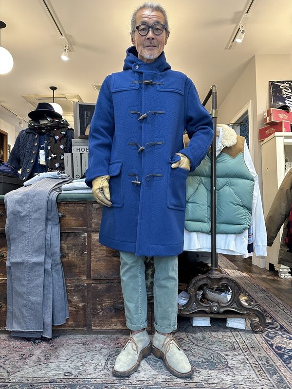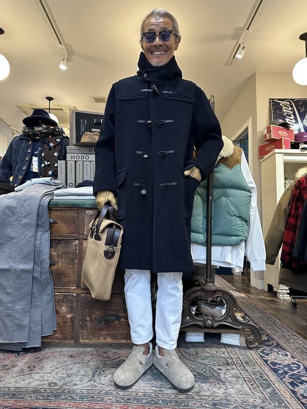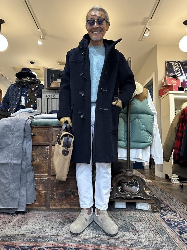 ボーイズ別注ホワイトデニムがネイビーのダッフルコートに良く映えてくれますね。