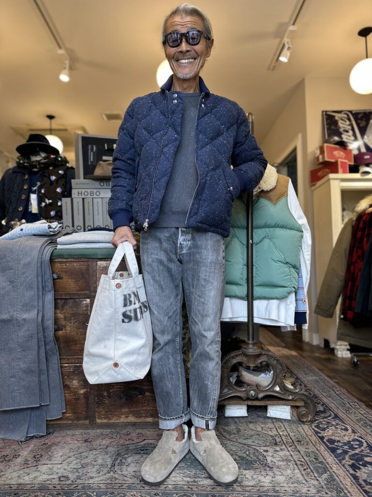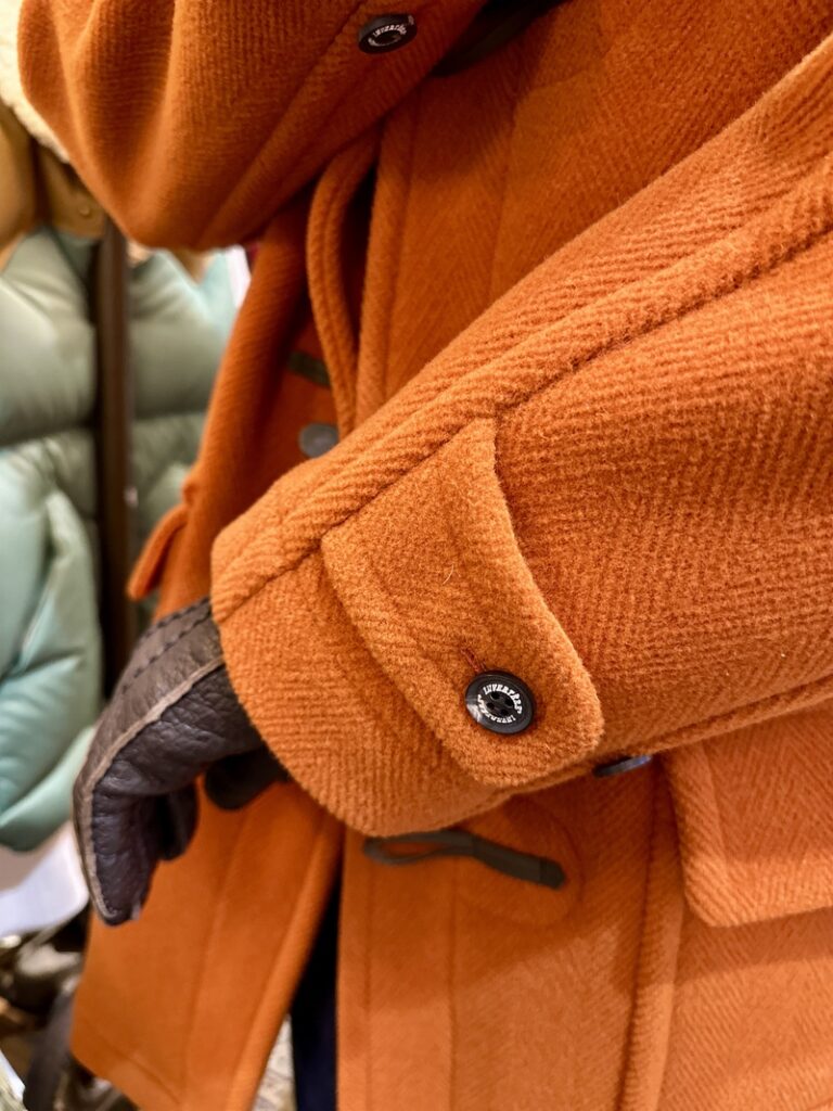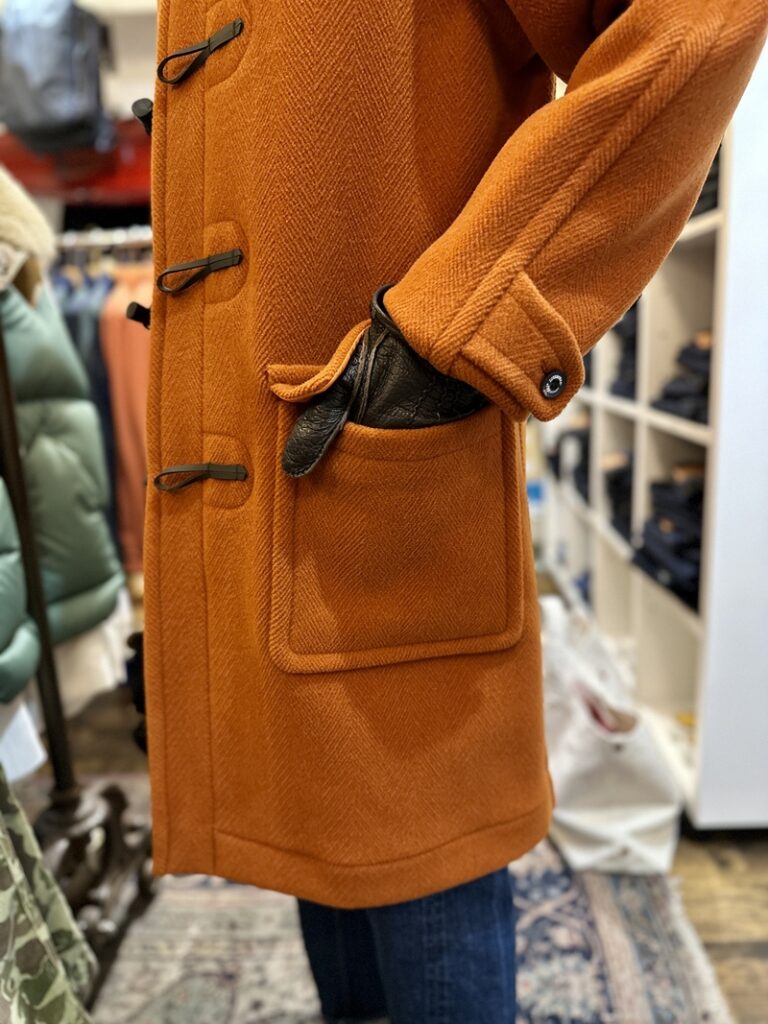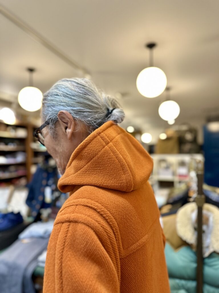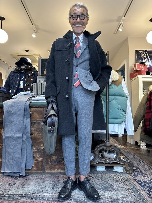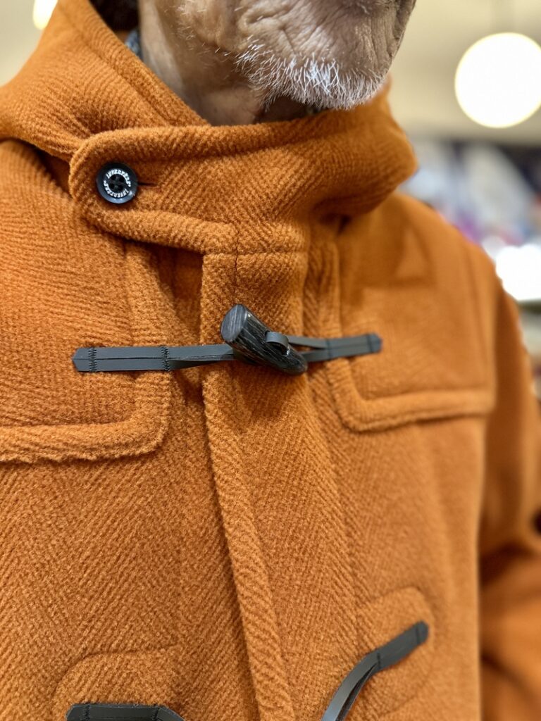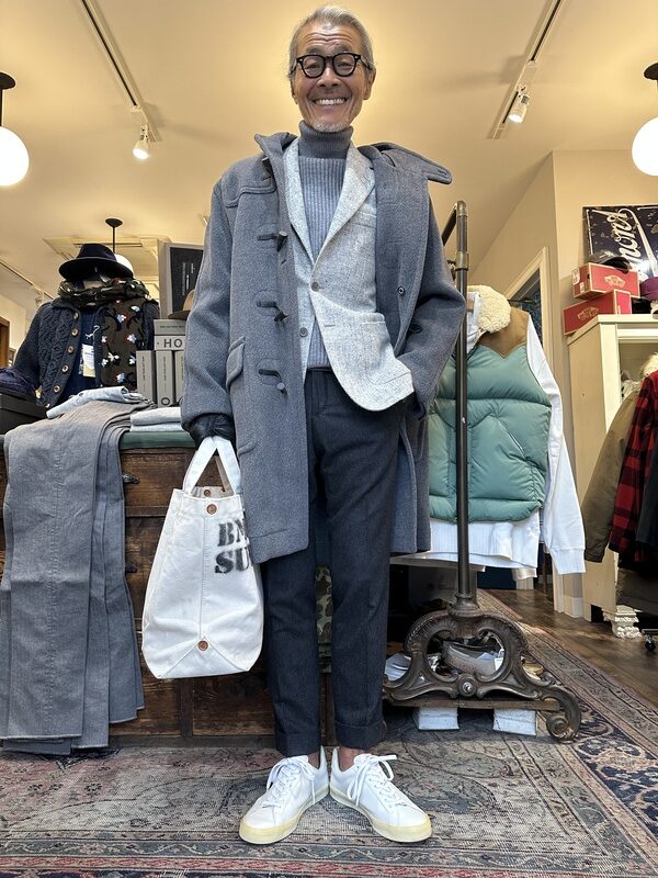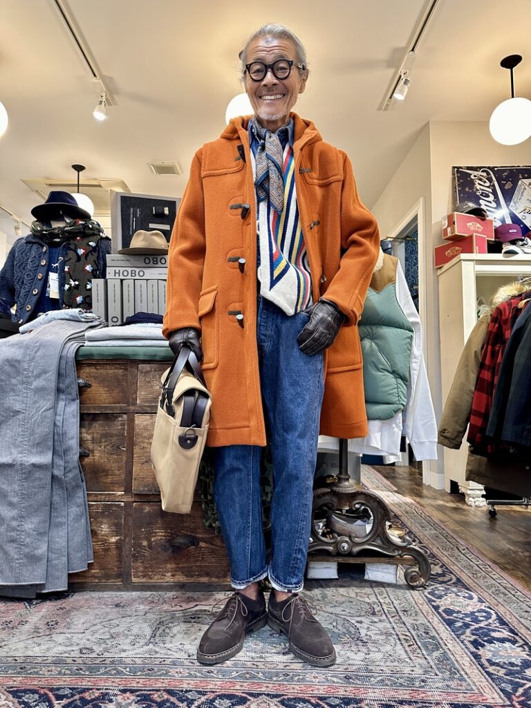 ボーイズ別注ホワイトデニムがネイビーのダッフルコートに良く映えてくれますね。