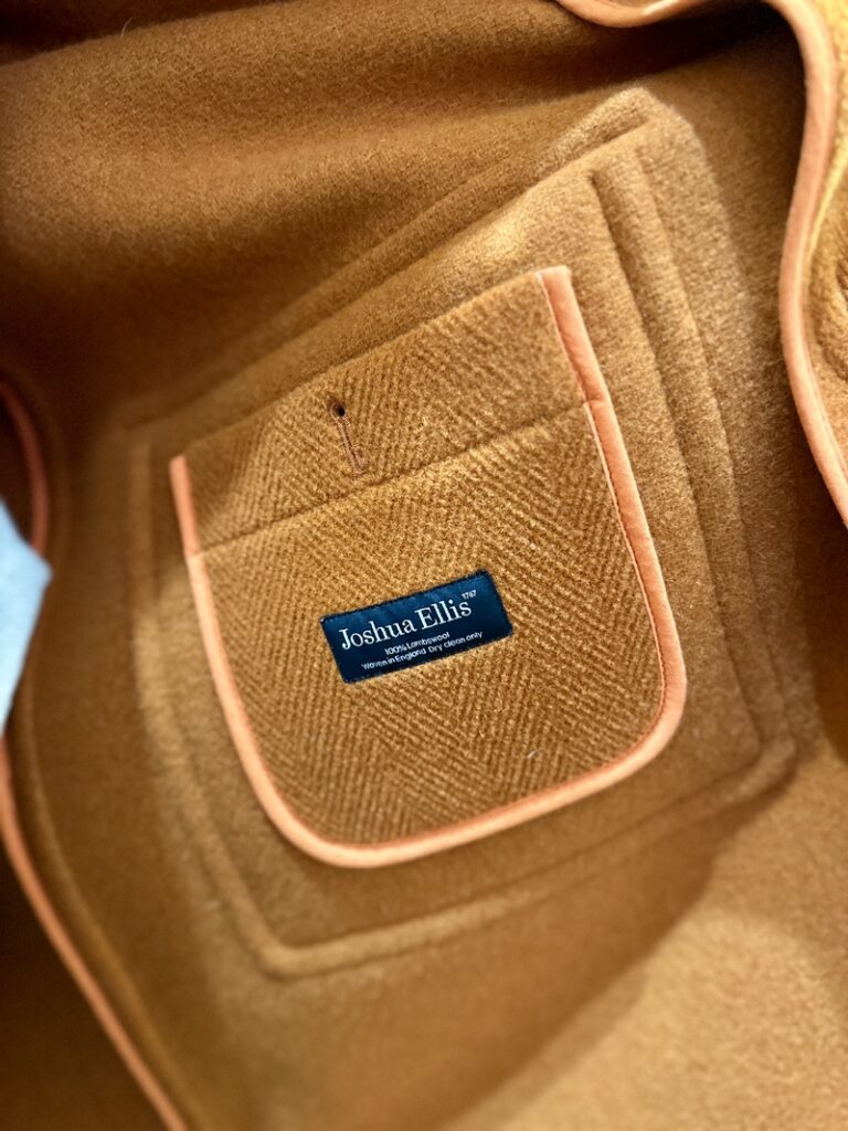 This duffle coat features a herringbone pattern, slowly woven on an antique loom owned exclusively by Joshua Ellis.