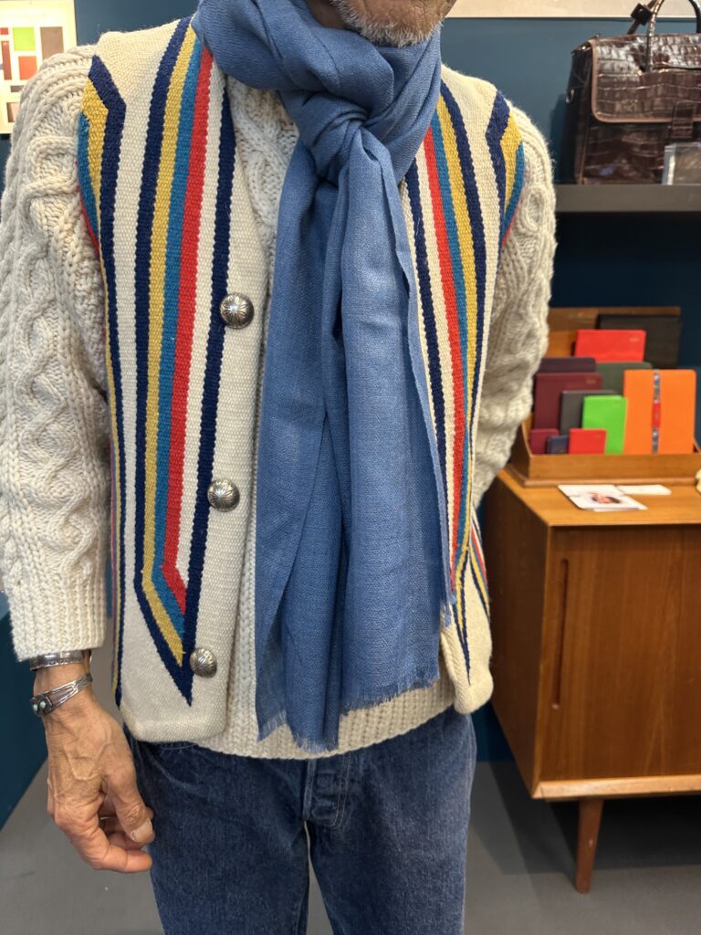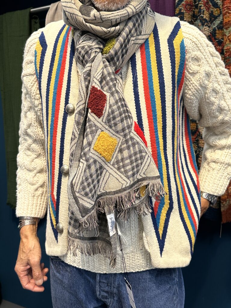 トラディッショナルなダッフルコートやPコートなどに巻かれますとコート自身が引き立つ一枚かと!