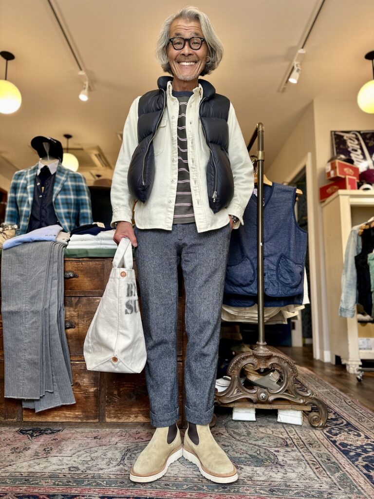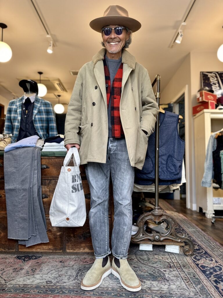 ベストなどレイヤードされまして英国製Chrysalisに別注しましたジープコートなどの装いにも良くお似合い