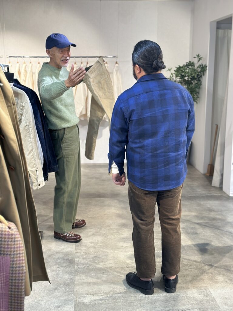 The apprentice tried on the brown sample, which was 33 inches, and listened to various trivia from Mr. Hayashi.