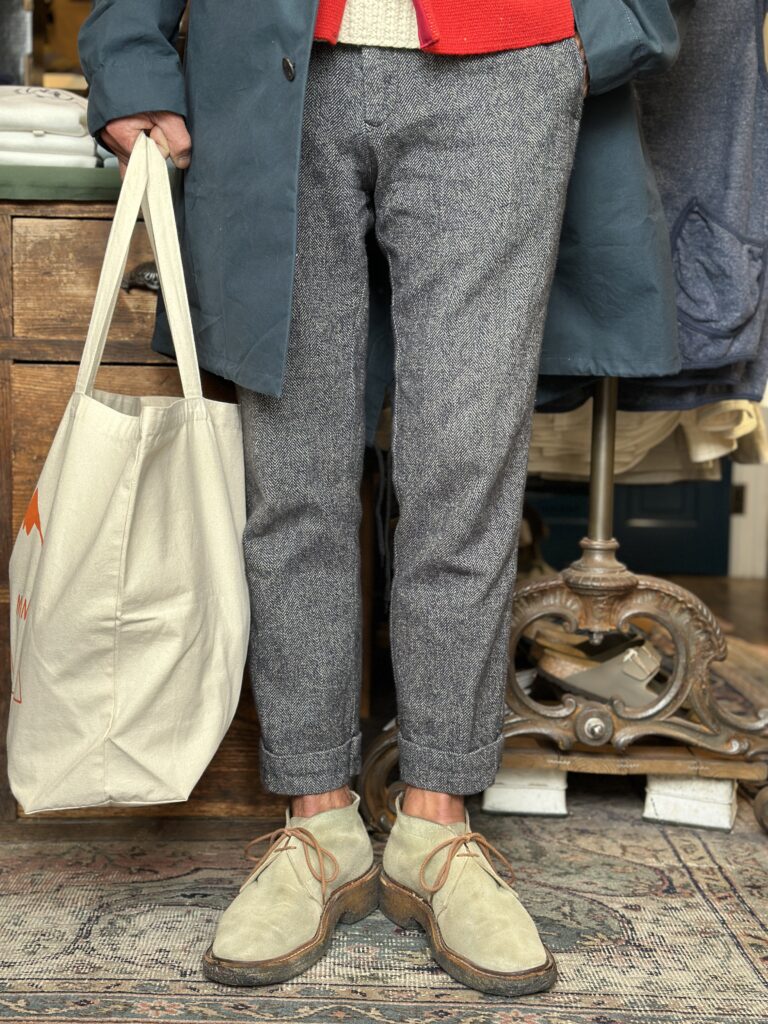 デザートブーツは英国、トラウザーズはMADE IN JAPAN そしてスウェーターは英国にベストはニューメキシコ