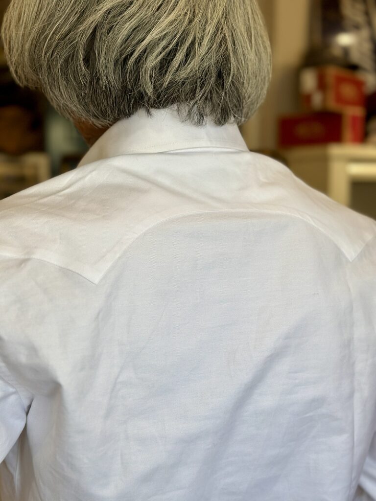 Western shirts are usually made with narrow armholes for competition, but this one is designed for everyday wear only, with the same armholes as our original boys’ BD shirts.